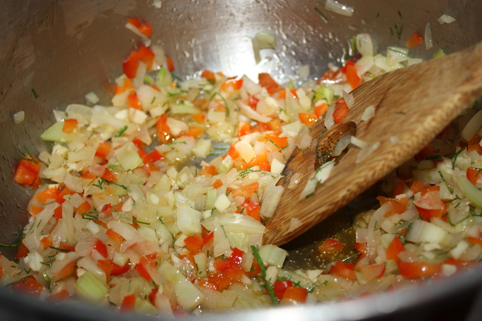 Start by dicing all the veggies, then clean all the seafood. Make sure the clams and mussels have no sand or dirt on them. Heat up the sauce pan with the olive oil over medium high heat. Add the veggies and garlic. Saute until onions are translucent.